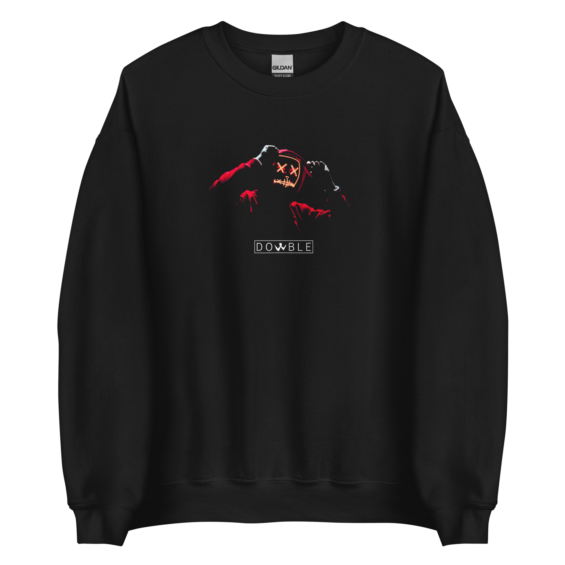 La maschera è resa con colori fluorescenti, come il rosso e l'arancione, che creano un effetto di luce notevole. La stampa è realizzata con una tecnologia avanzata che garantisce una nitidezza dei dettagli incredibile, con linee precise e nette che danno un aspetto moderno e dinamico alla felpa.